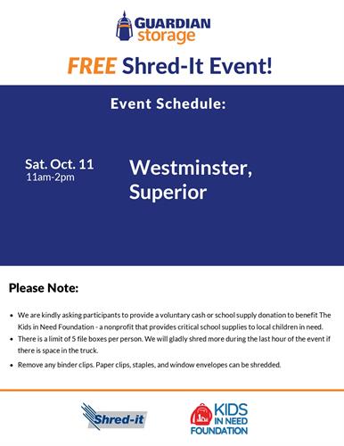 As a thank you to our community, we are pleased to provide a FREE 3-hour Shred-It event at our Superior location. There is a limit of 5 file boxes per person. We will gladly shred more during the last hour of the event if there is space in the truck. We are kindly asking participants to provide a voluntary cash or school supply donation to benefit The Kids in Need Foundation - a nonprofit that provides critical school supplies to local children in need.