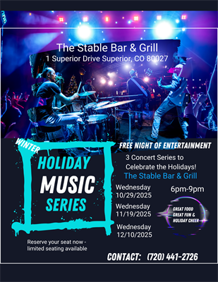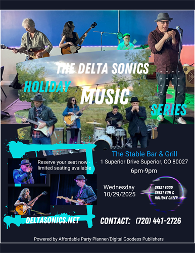 Enjoy a 'Free' evening with a musical gift of this holiday season at The Stable Bar & Grill between 6pm-9pm, starting 10/29/25 with music guests "The Delta Sonics". Let's kick off your Halloween celebration with "Chicago Blues Style Band". (Halloween Costumes are Optional)  -Powered by Affordable Party Planner/Digital Goddess Publishers.